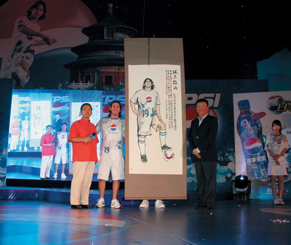 由于这是梅西第一次来到北京,主办方特意为“新球王”安排了一系列颇具中华民族特色的节目。京津两地百事公司总经理江关安先生为梅西送上了东道主的见面礼——一幅“球王梅西”的国画。画上的梅西身着百事球衣,脚踏百事足球昂首挺胸,一股英武的王者之气蓬勃而出。这幅画的作者是著名国画大师黄胄先生的得意门生杨秀坤先生。梅西当即表示,他会将这幅画挂在自己家里的墙上。在杨秀坤的指导下,梅西也好奇地拿起了他从没见过的中国毛笔,写下了“北京你好”四个大字,而且还在后面用毛笔签上了自己的名字“Messi”,作为回赠主办方的礼物。这也是第一位世界足球巨星用中国毛笔书写汉字。